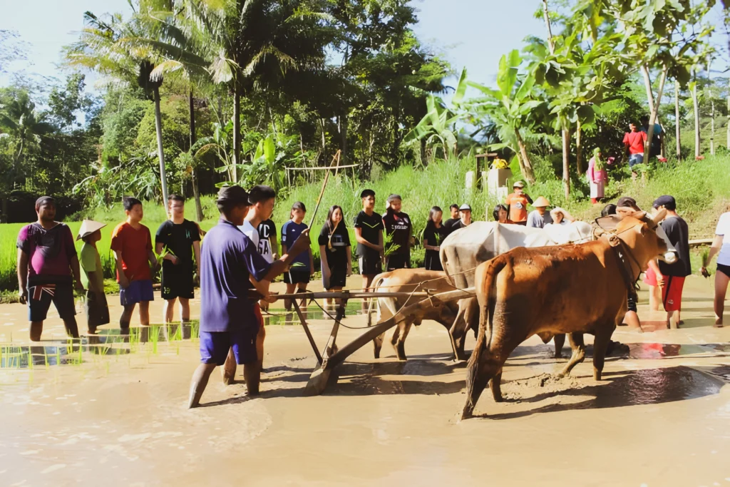 Belajar menanam padi dan membajak sawah secara tradisional bersama bapak