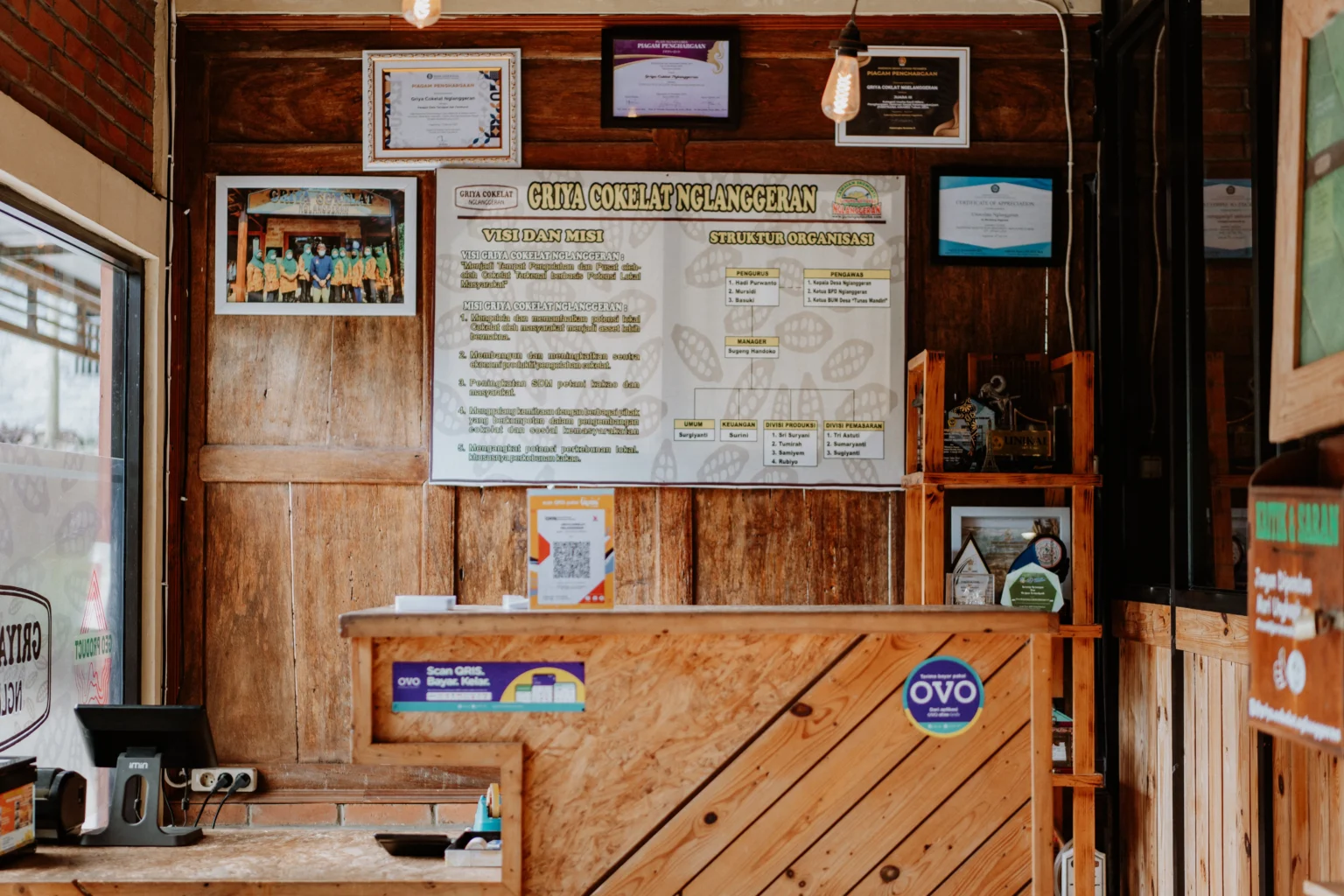 Tempat yang bersih dan penataan produk yang rapi. Pelayanan ramah dan informatif. Interior sangat niat menyesuaikan tema. Suasana menyenangkan, khas pedesaan. Produk-produk lokal warga Ngelanggeran dijual dengan harga terjangkau. Semua produknya enak, mulai dari bakpia, cokelat batang, minuman cokelat, keripik pisang salut cokelat, dan masih banyak olahan lainnya.