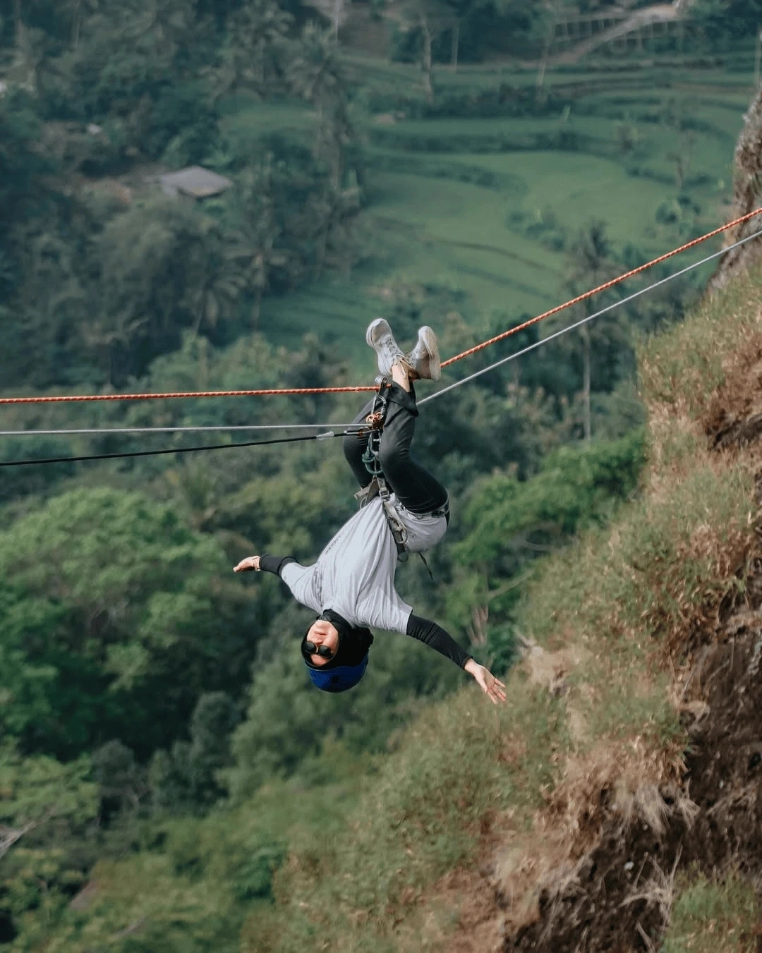 Mulai aksi paling ekstrim seperti menyeberangi jurang dengan menggunakan tali (slackline/zipline) antara dua bukit batu yang tinggi.